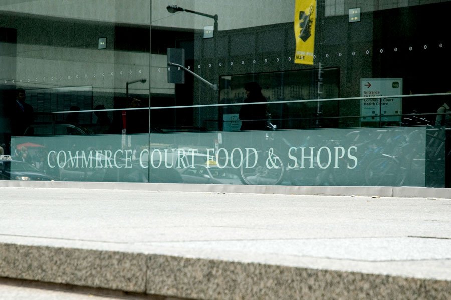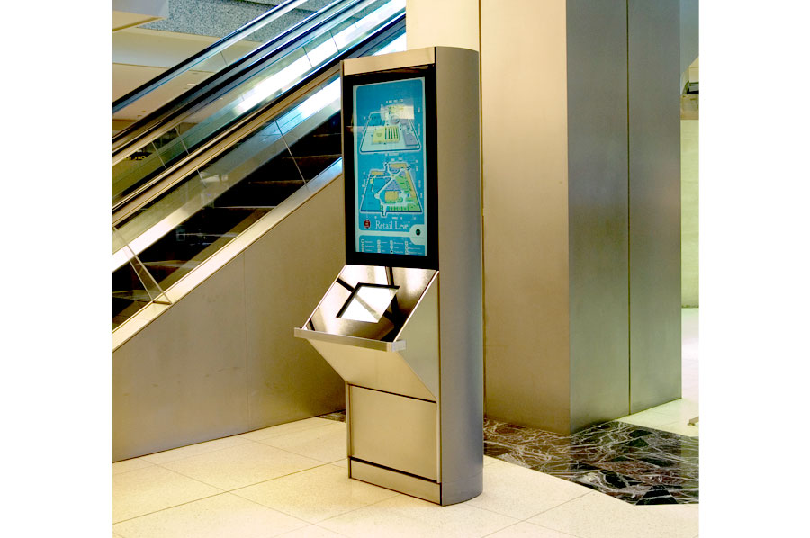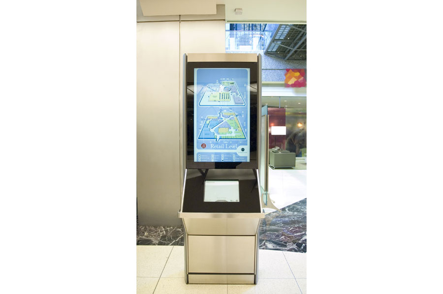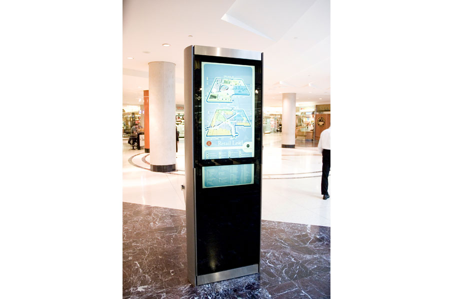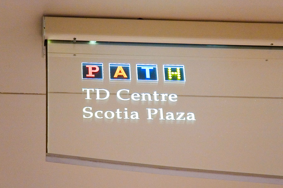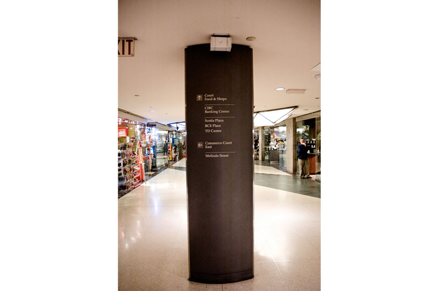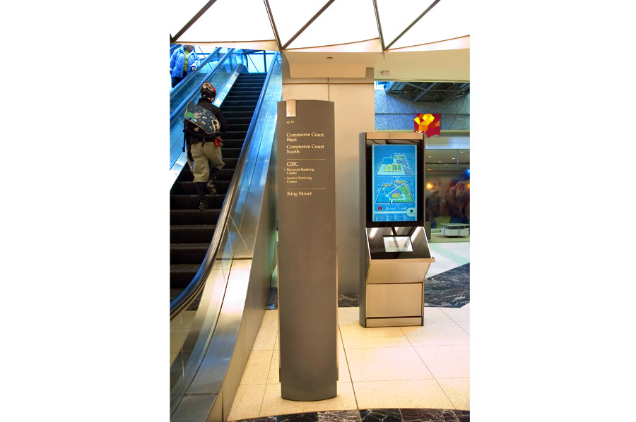 Highlights: Building identification on main entrances are waterjet cut, stainless steel, pin mounted graphics. The Site Identification sign is a 48 inch diameter, double sided internally illuminated Commerce Court Logo. Computerized touchscreen directories are kiosk type, built with 3/16 inch thick painted aluminum with pewter metallic finishes and incised acrylic backlit maps. Touchscreen monitors feature removable 3/16 inch transparent bronze tempered glass. Pylon way-finding signs and direction signs are both duracron and stainless steel with aluminum reveals. For the way-finding pylon signs, text graphics are etched/engraved and filled with the arrows being incised 3/16 inch stainless steel. Hanging Signs throughout the underground court are 3/16 inch edge lit acrylic featuring full colour PATH system identification and mounted flush to the ceilings.
