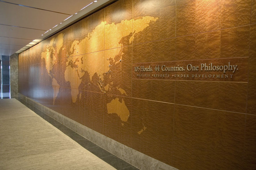 Scope: Soheil Mosun Limited was contracted to build a history wall display illustrating the "Values & Beliefs" of the Four Seasons Hotels and Resorts, as well as a world map showing current and planned locations of hotels and resorts. Also included are (3) large glass, wood and steel cases that present and display photos and artifacts that fill the history corridor between the lobby and the atrium in the Four Seasons Hotels and Resorts headquarters in Toronto, Canada.