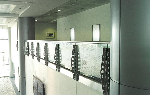 Highlights: Field dimensions yielded slab alignment variances in excess of 4" off plumb. Our designers and site forces overcame this problem by introducing structural shims that resulted in a "gun barrel" straight installation. Over 200 fritted glass panels and 1300 linear square feet of balustrades.