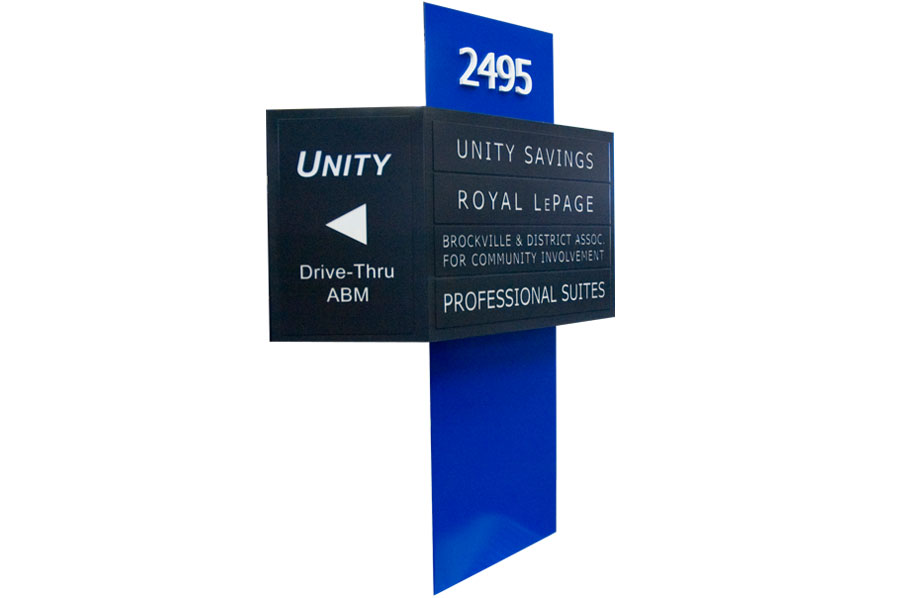 Highlights: These internally illuminated pylon signs are constructed of aluminum with acrylic internal panels. They feature solid and rugged 1/4" thick welded aluminum frameworks with 1/8" thick aluminum cladding which is painted with heavy duty, long lasting exterior paint. The base plates are 1/4" thick aluminum and the internal light fixtures are 1/16" thick formed aluminum. The graphics are precision cnc cut with acrylic backing attached to the sign panels with #10 welded studs for durability and longevity. Both pylon signs are mounted to concrete pillars.
