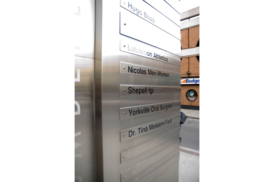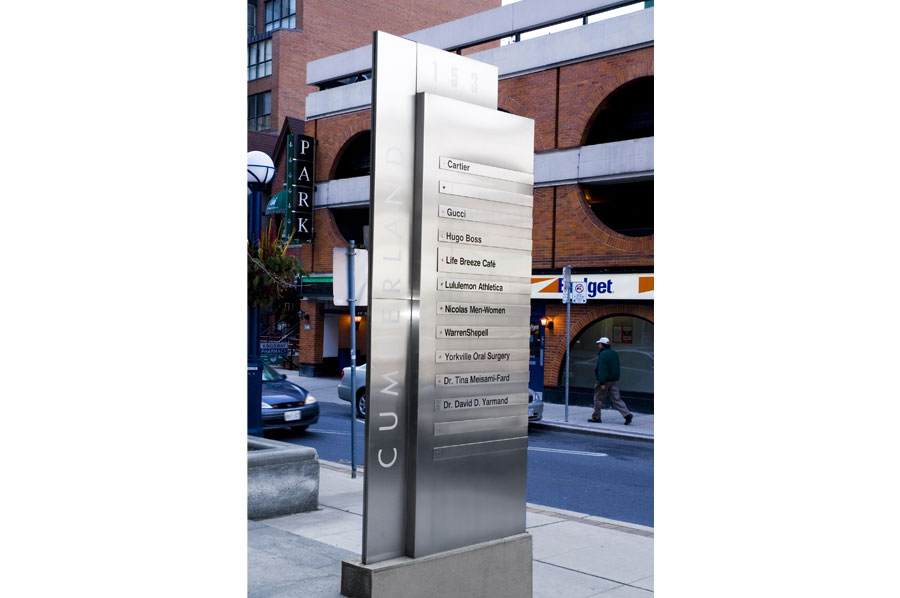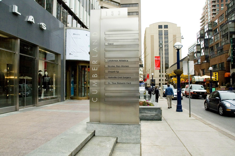 Scope: Soheil Mosun Limited was contracted to design, fabricate and install the 11'x4' stainless steel building and tenant identification pylon sign at 153 Cumberland Avenue in Toronto's Yorkville district.