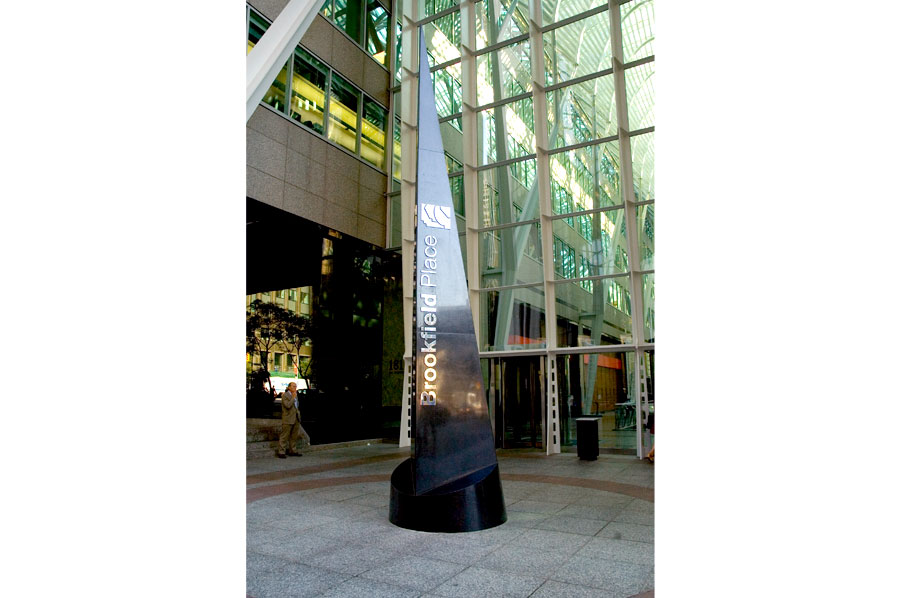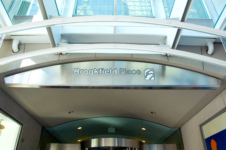 Highlights: This project employed state of the art waterjet cutting machinery to produce channel lettering cut from solid stainless steel as well as logo graphics to be used on exterior signage. All Text Graphics are 1/4" thick Alloy 316 Stainless steel for exterior application and 1/4" thick Alloy 304 Stainless steel for interior application. The exterior pylon signs are granite and stainless steel while interior directories are stainless steel, glass and Lexan. The buildings were undergoing a complete branding change and needed to have all remnant brands removed and replaced with the new Brookfield Place brand identification.