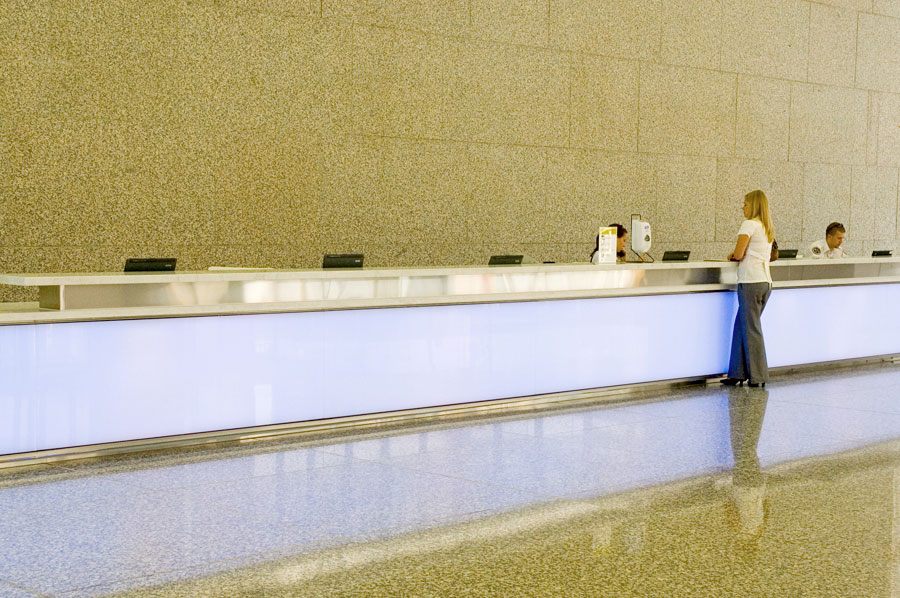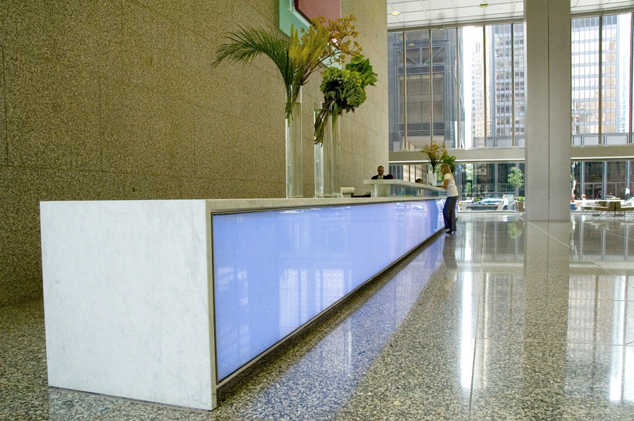 Highlights: The concierge desk is 60 feet long. The frame of the concierge desk is cold rolled steel tube welded and mounted to a 2" granite block above a 3 1/2" concrete slab. The marble is 3/4" slabs of Bianca Carrera. Alloy 304 stainless steel is used for all visible metal finishes. Lighting system is a programmable rgb led system seated behind starphire glass panels and reflected out using specular aluminum panels. The marble is polished to a satin finish and appears seamless overall due to the use of large continuous slabs wherever possible. The desk is the dominating feature of the atrium.