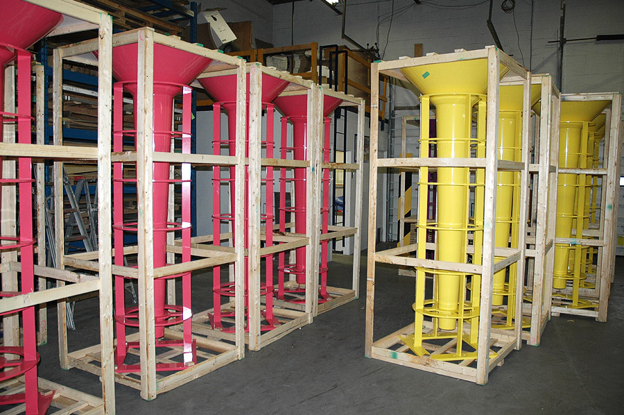Highlights: Each 2.3 meter tall structure was fabricated from (2) seamlessly welded spun aluminum cones and features (5) waterjet cut rings - designed for aesthetics and support. The structures are powder coated in traditional Barbadian colours.