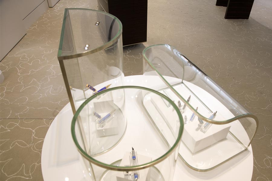 Highlights: The cases feature brushed nickel-silver alloy, curved and formed, trims, accents, pulls and other operational hardware as well as custom slumped Starfire glass components in the creation of the low curved display cases, tall eliptical and square showcases, table top vitrines, internally illuminated vases and furniture, with the highest possible craftsmanship.