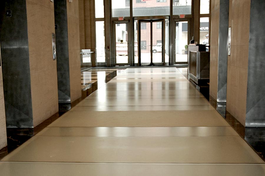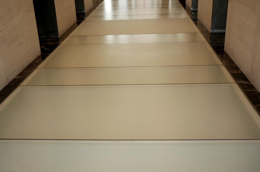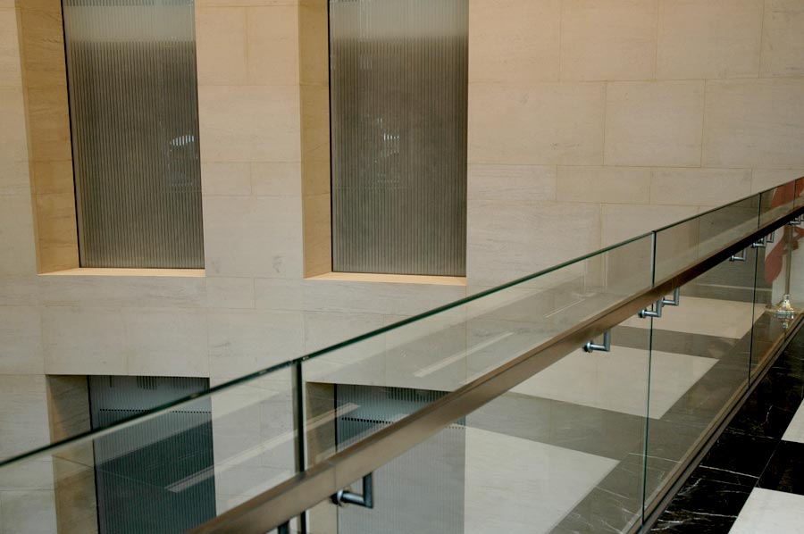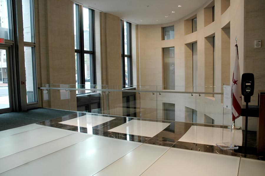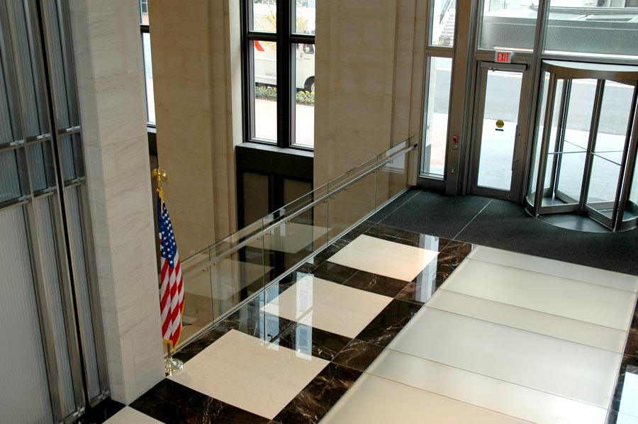 Highlights: The lobby glass floor, balustrades and railings were engineered and fabricated by Soheil Mosun Limited to include 1 1/4" thick, 3-layer laminated glass panels with fritted surfaces that provide a translucent, non-slip finish. The glass floor is supported with concealed steel I-Beams which were set to leave final glass surface perfectly flush with the adjacent stone floor. Glass balustrades around the floor were fabricated from laminated glass and feature stainless steel handrails and custom machined stainless steel hardware. In January 2010, SML was selected the winner of the Washington Building Congress Craftsmanship Award® which recognizes SML's outstanding skill and achievement on its scope of work for the 700 Sixth Street NW project.