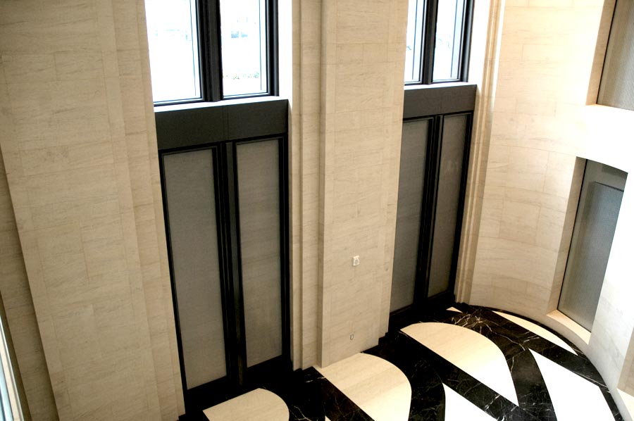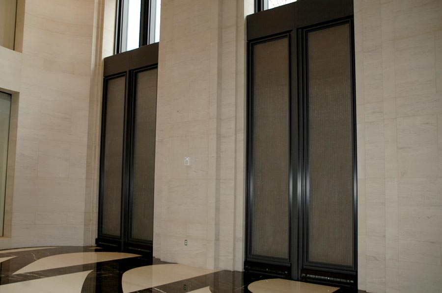 Highlights: The custom air intake louvers are fabricated from painted aluminum extrusions which frame stainless steel architectural mesh panels. The lobby directory face panel was fabricated from stainless steel with water jet cut out openings for screen and speakers. Custom concealed hinging keeps panel flush with stone wall. In January 2010, SML was selected the winner of the Washington Building Congress Craftsmanship Award® which recognizes SML's outstanding skill and achievement on its scope of work for the 700 Sixth Street NW project.