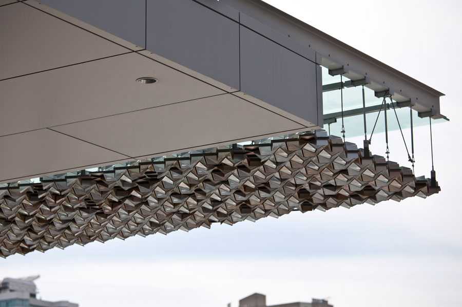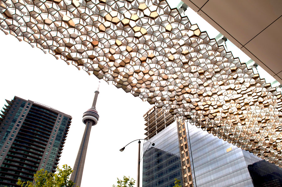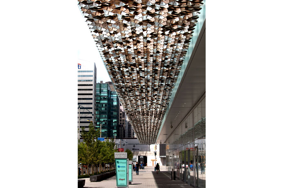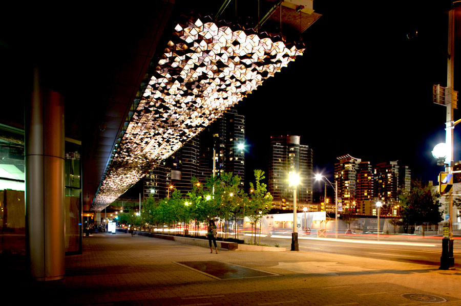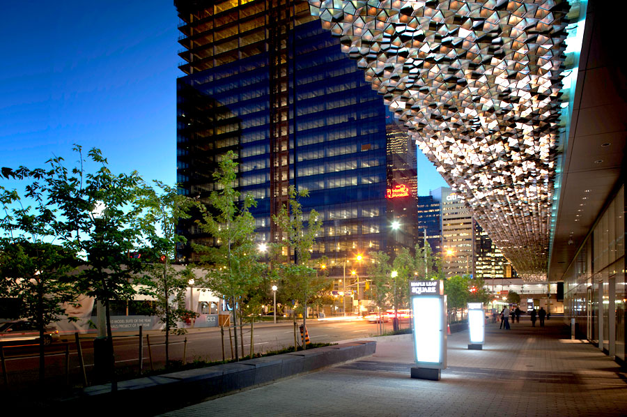 Scope: Soheil Mosun Limited was contracted to design build, engineer, manufacture and install this illuminated canopy and work of public art at Maple Leaf Square in downtown Toronto.
