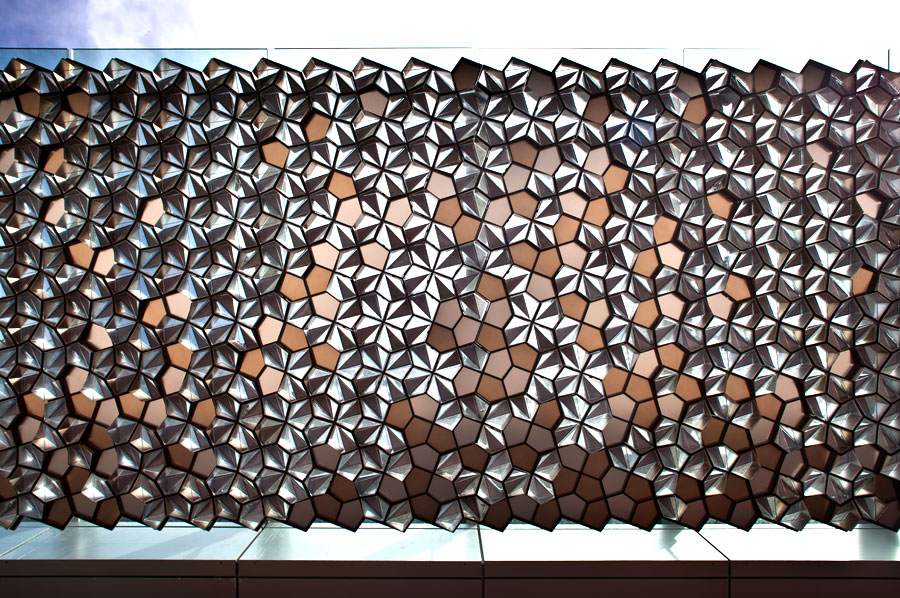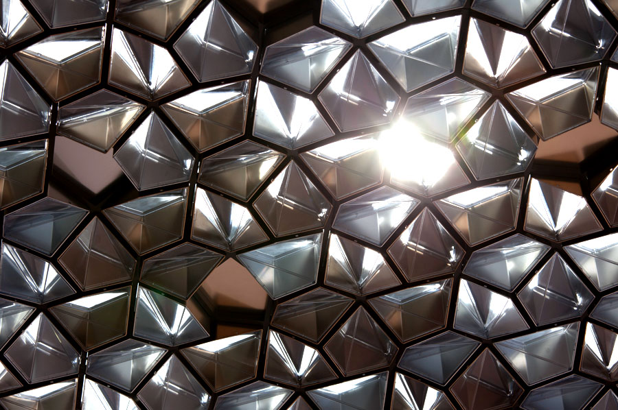 Highlights: The canopy uses modular units which are frame mounted to hold each individual LED and lens component. There are 8200 modules overall that display a synchronized pattern through use of computer controlled digital signal output. The canopy is suspended by stainless steel cabling system beneath 1/4" thick glass panels. The framework is powder coated steel and the modules are anodized aluminum extrusions with each module placed individually into the framework. The canopy is approximately 300' long and 10' wide.