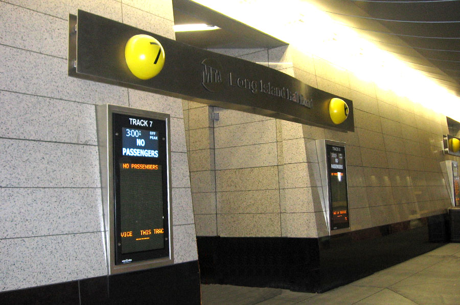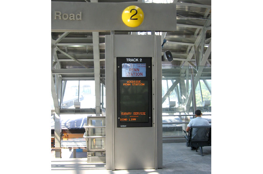Highlights: Girders made out of solid 1/2" thick stainless steel plate measuring 23 feet x 2 feet complete with 1/2" thick solid stainless steel logo/letters and track identifier on spun and painted metal globe all pinned mounted with concealed fasteners to curved surface of girder. 10'-0" high column structures consists of carbon steel support structure with stainless steel cladding incorporating LED signboard within the column. All T316 stainless steel components were finished with non-directional orbital finish.