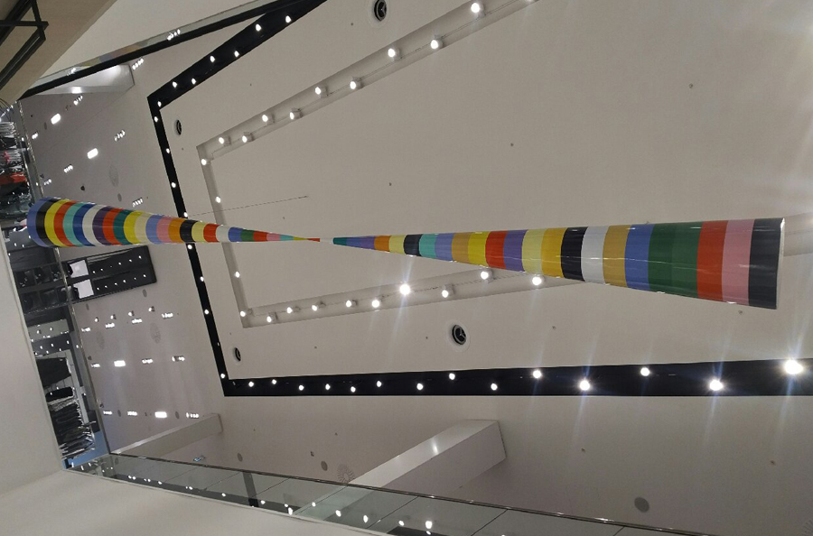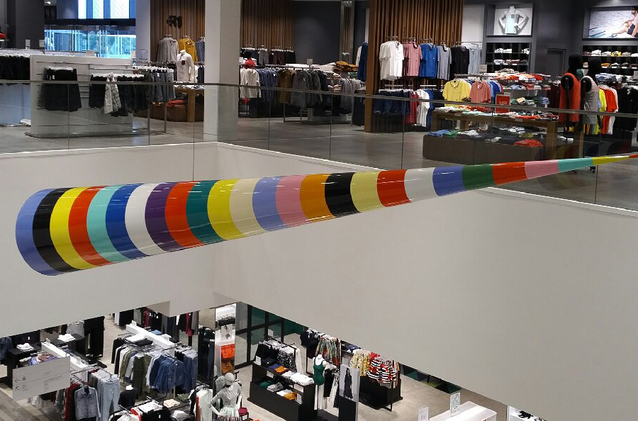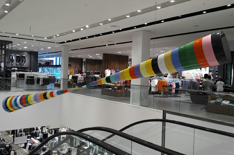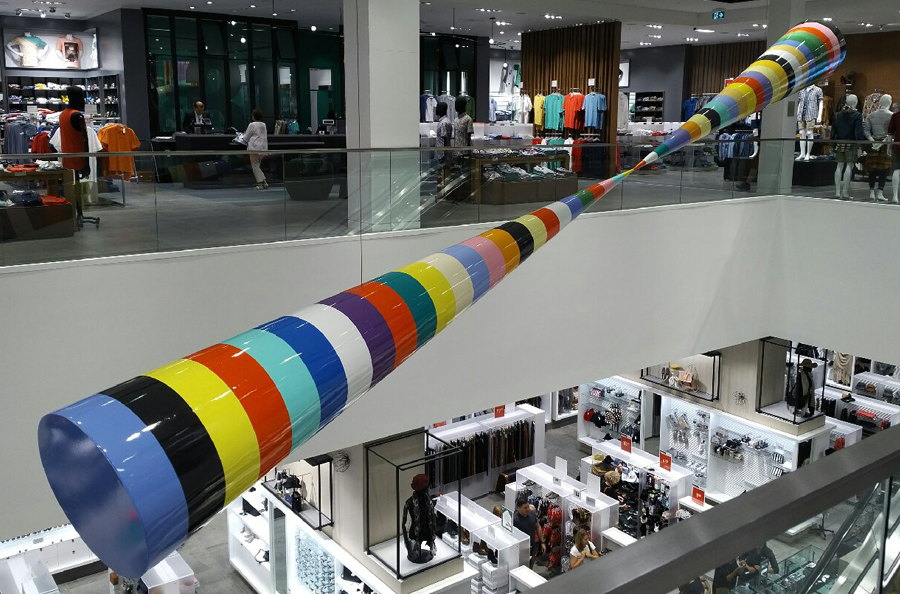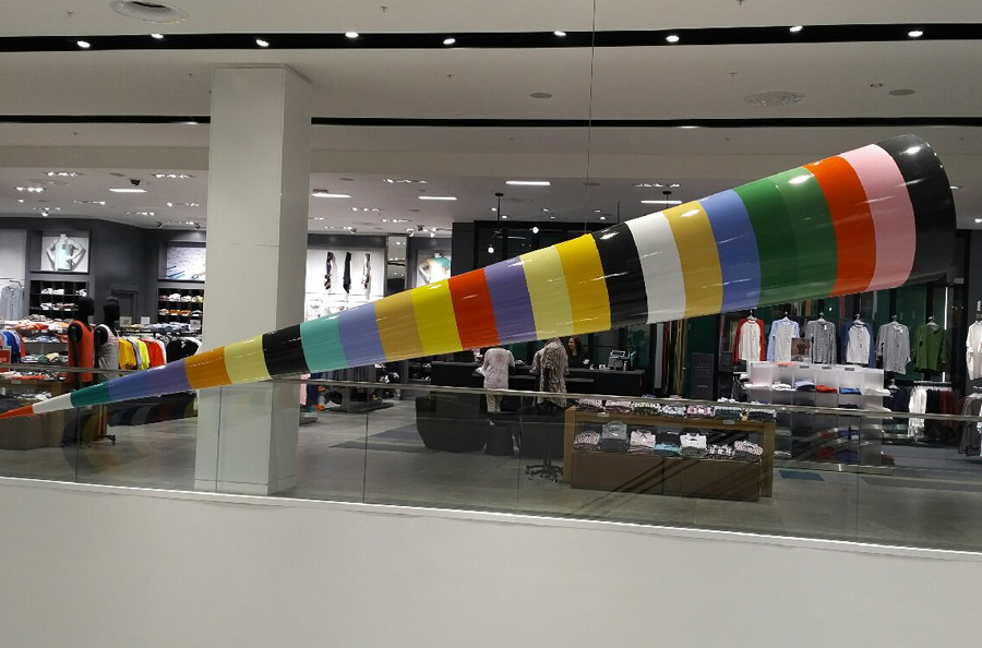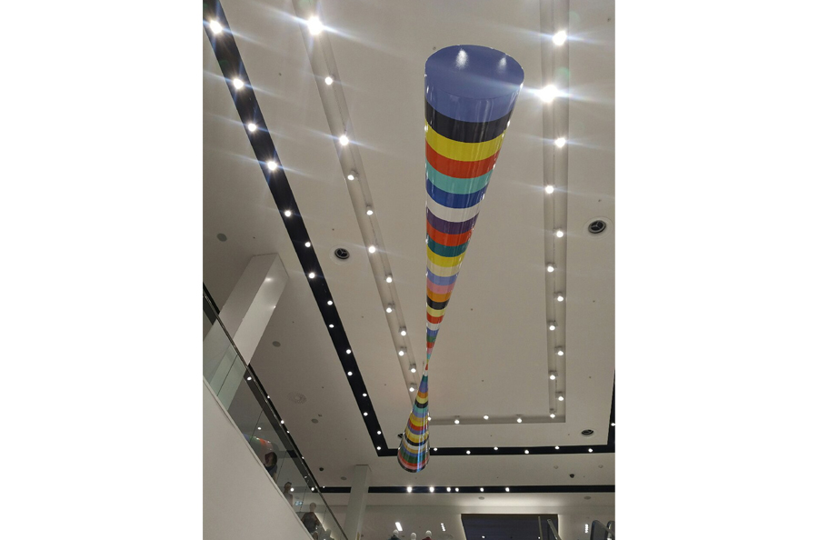 Scope: This Public Art project was produced for famous Canadian novelist, artist and one of Canada's foremost cultural figures Douglas Coupland. It was commissioned for the Simons department store at the Park Royale Shopping Centre in West Vancouver. The art piece known as "Bowtie" consists of (2) 18'-0" long x 48" in diameter cones (at the large end), fabricated from 1/4" fiberglass over an aluminum structural frame.