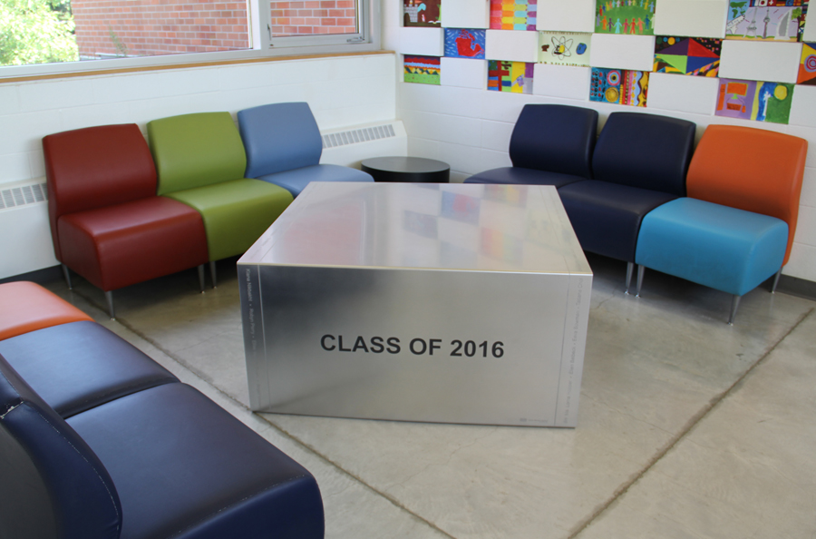Highlights: The table is 1/8" alloy 304 stainless steel in a single piece, formed, then etched, infilled and orbital brush finished. It has the etched names of all the students and teachers for the graduating class of 2016 around the delineated border of the table, separated by etched dots and within an etched border. The table is 48" square and 23.5" in height. The letters are 2 1/2" high on the main text "Class of 2016" and the school logo is 6" wide and approximately 8" in height, etched and infilled in the schools deep blue colour.