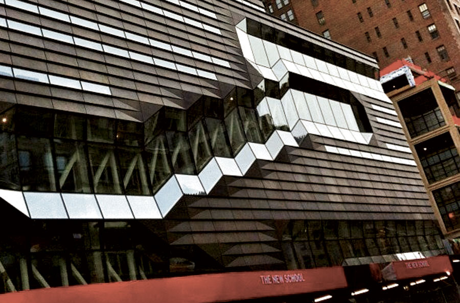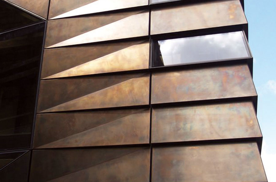 Scope: Soheil Mosun Limited was contracted to patinate thousands (approx 7500) of muntz bronze panels which comprise the cladding of the (16) story building envelope at The New School, in New York City, located at 65-5th Ave.