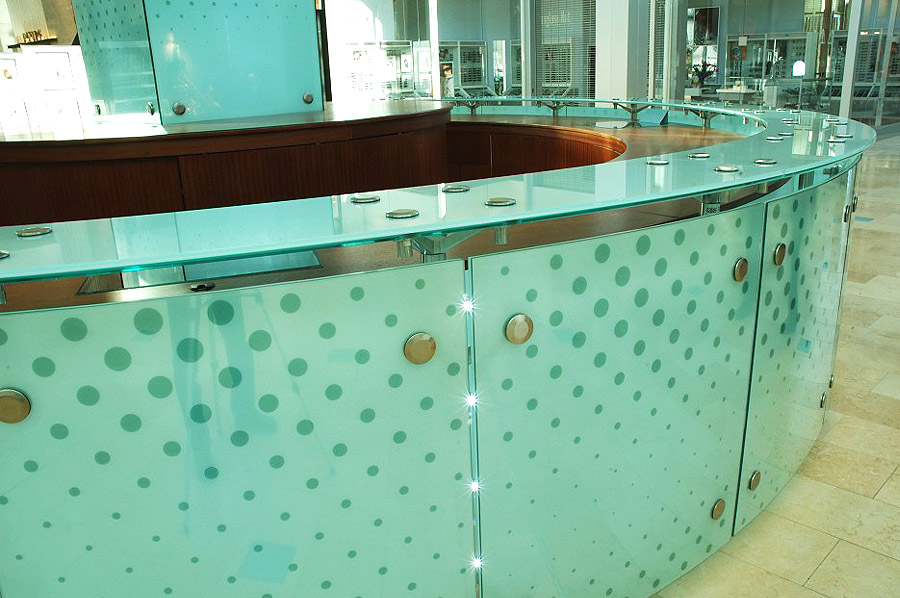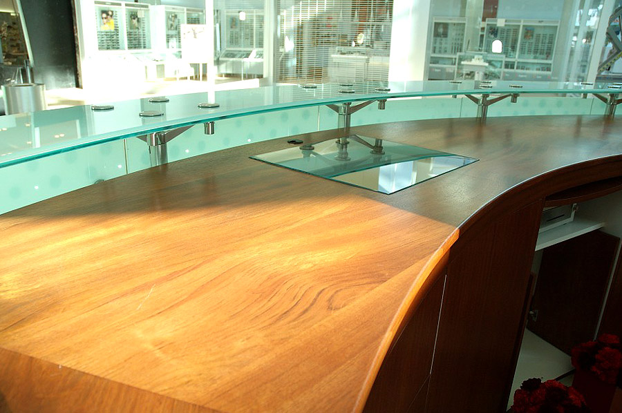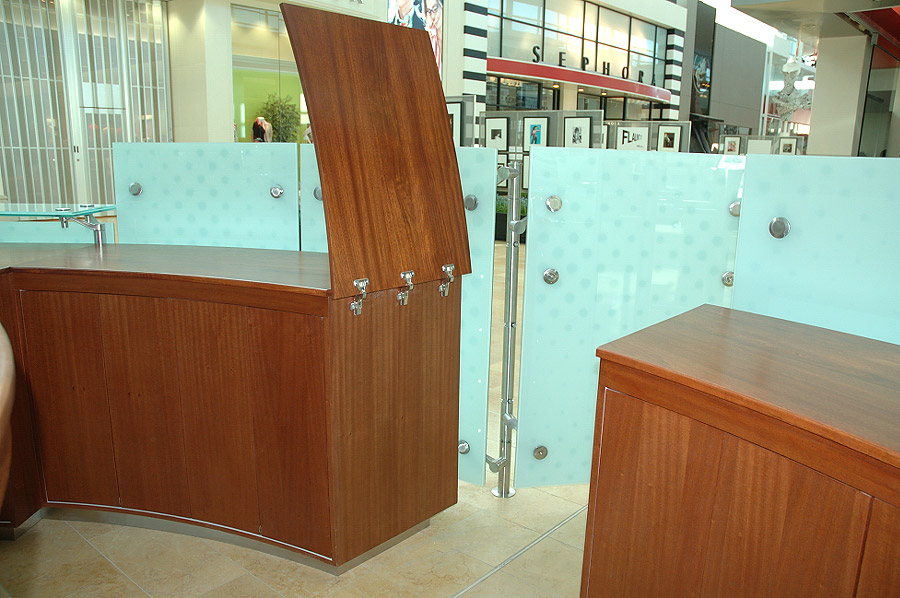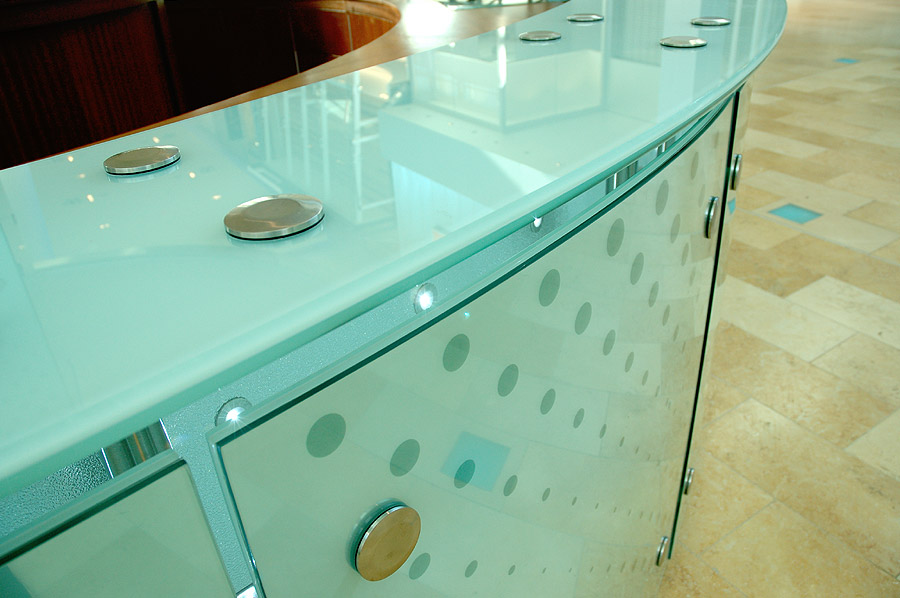 Highlights: This project demanded almost full resources for its duration. This one-of-a-kind customer service desk features exotic jatoba wood cabinetry, integrated computer terminals, curved outer glass hull backlit with low temperature and high duty cycle LED's.