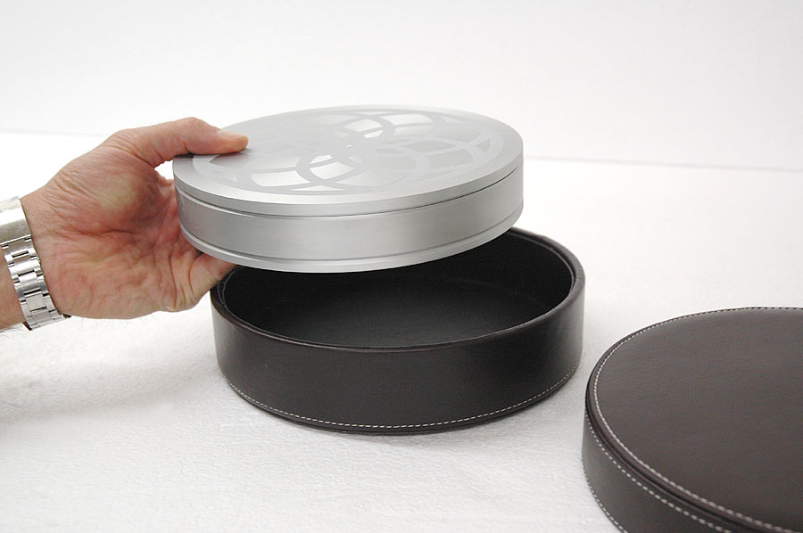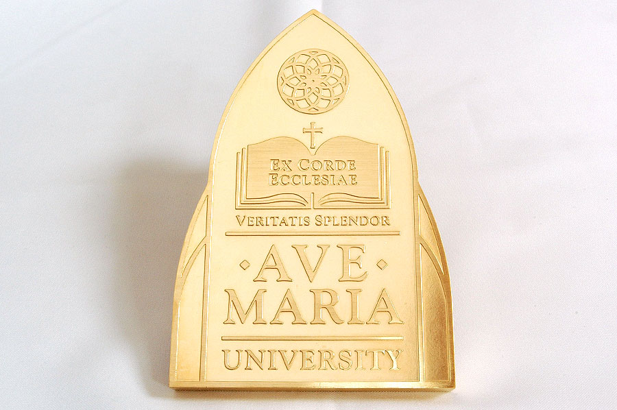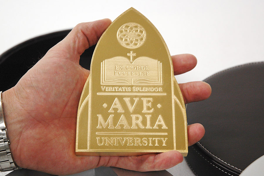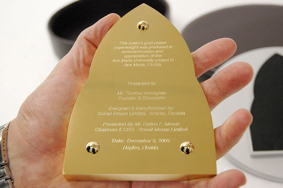 Highlights: This exquisite custom piece was waterjet cut from 1/2" thick solid bronze plate. The logo on the front was acid etched, while the inscription on the back of the paperweight was engraved using the three-dimensional machining centre. The final process was 24-karat gold plating. The accompanying metal holder was machined from a solid block of aluminum and features a beautiful watermark etched crest and gold plated feet, all complimented with a striking handmade leather carrying case.