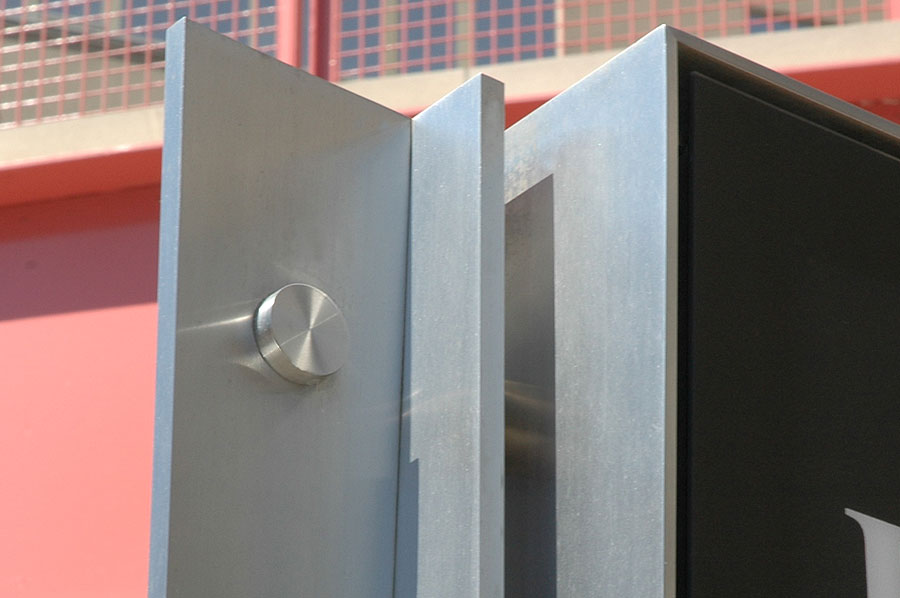 Highlights: The outdoor identification pylon sign is made of brushed stainless steel. Sign faces are made of lexan plastic with back printed graphics and feature double sided internal illumination. The shield sign is a painted aluminum box with brushed st. stl. trims and a curved lexan graphic face which also houses internal illumination.