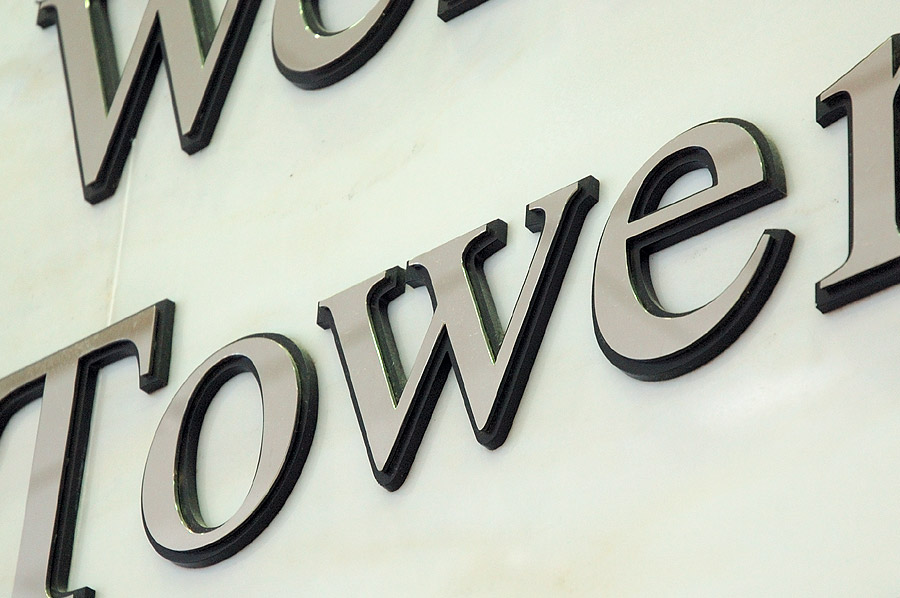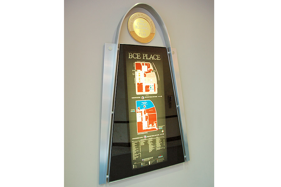 Highlights: The flat wayfinding directory found upon entering from Bay street is made of brushed stainless steel frame structure. The concourse retail directory is made of a brushed st. stl. arch frame - both are equipped with internally illuminated sign face graphics. The individual letter identification is made of waterjet cut 1/8" thick mirror polished st. stl. letters mounted onto 1/4" thick waterjet cut black anodized aluminum letters. The total signage package program smoothly integrates into the buildings' architecture.