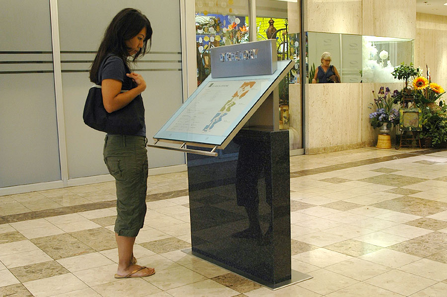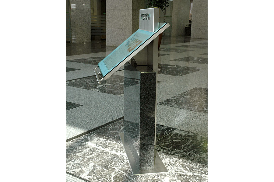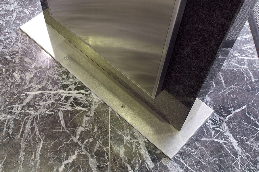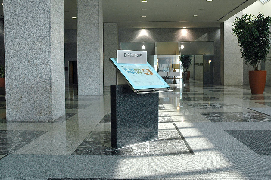 Highlights: Directories utilize a welded steel sub-frames, with Nero Impala black granite cladding at the bottoms, stainless steel cladding at the tops, and cantilevered clear glass faces protecting full-color printed maps and tenant information.