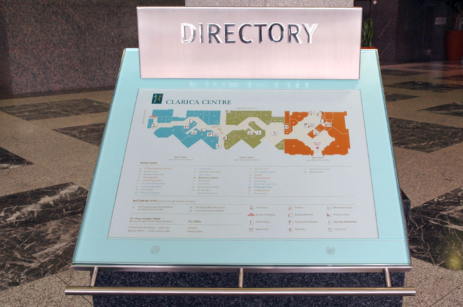 Scope: Soheil Mosun Limited was contracted to fabricate and install 3 non-illuminated, interior building directories for a 3-tower combined commercial and retail centre at the corner of Islington Ave. and Bloor St. West.