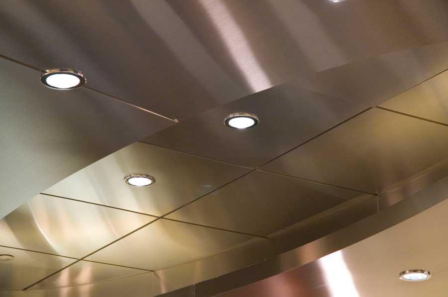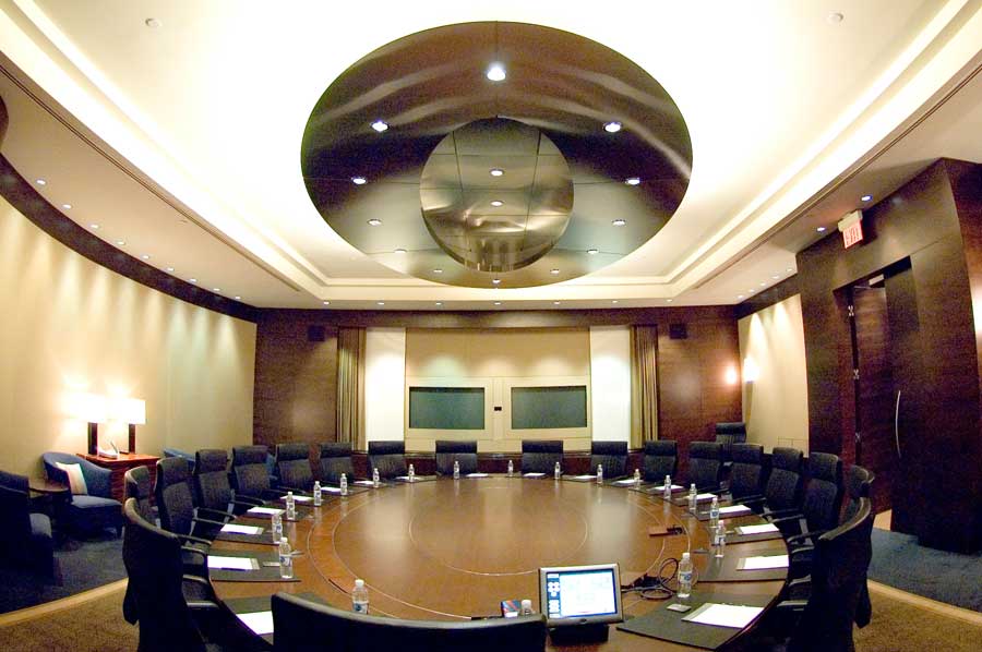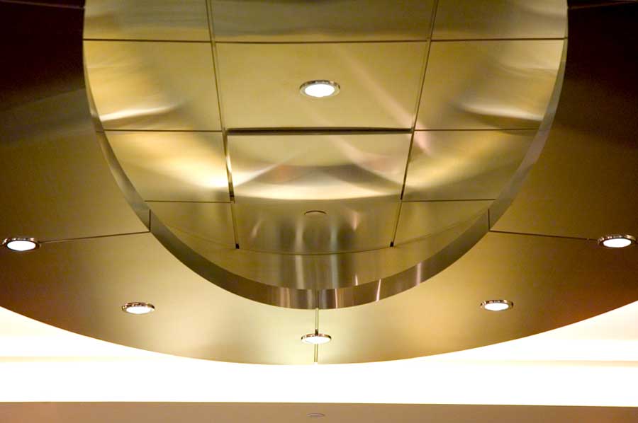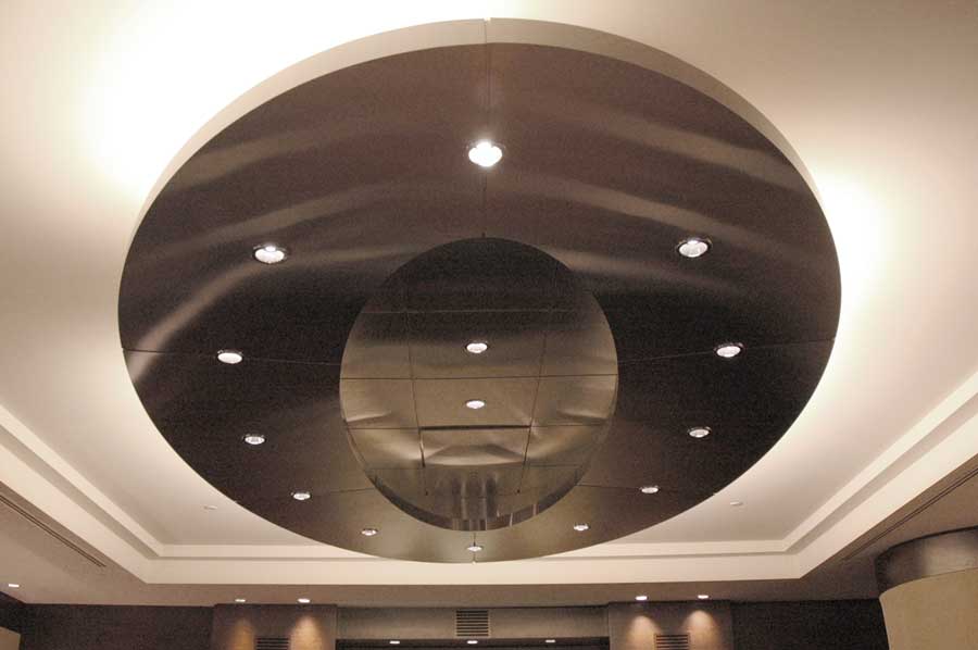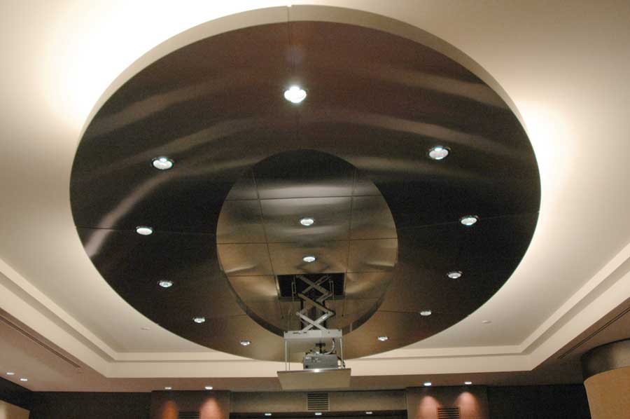 Scope: Soheil Mosun Limited was contracted to fabricate and install (2) elliptical stainless steel ceiling fixtures that provided primary lighting and had hidden projection units with remote control accessibility built into them.