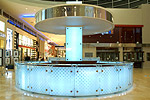 Customer Service Desk - Exotic jatoba wood cabinetry, integrated computer terminals, curved outer glass hull backlit with high duty cycle LED's